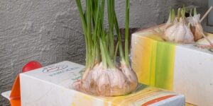 パイロンの空箱利用のニンニクの芽出し1週間でご覧のように芽が …